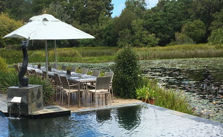 The rim-flow infinity ledge of our black-marbled, Zen-style swimming pool makes it look like the pool is actually one of our beautiful lily ponds. Surrounded by wooden decks on various levels, with lush gardens and the natural forest in the background, and with palms and indigenous, pink-flowered keurboom trees to provide welcome shade, this is the perfect place to laze away a hot summer's day.