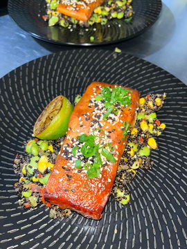 Grilled Line Fish of the Day on a Bed of Hummus, Roasted Chickpea, Spinach & Red Onion with a Smoked Paprika & Lemon Butter