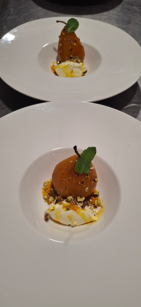 Saffron Poached Pear with Mascarpone, Ginger Glaze & Roasted Pistachio